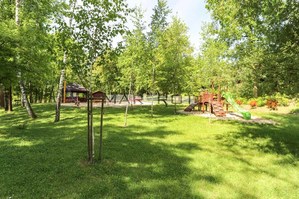 Wspólny plac zabaw, zadbany park i malownicze jeziorko.