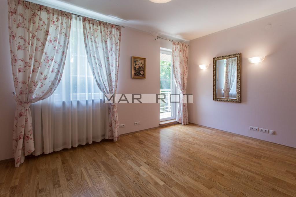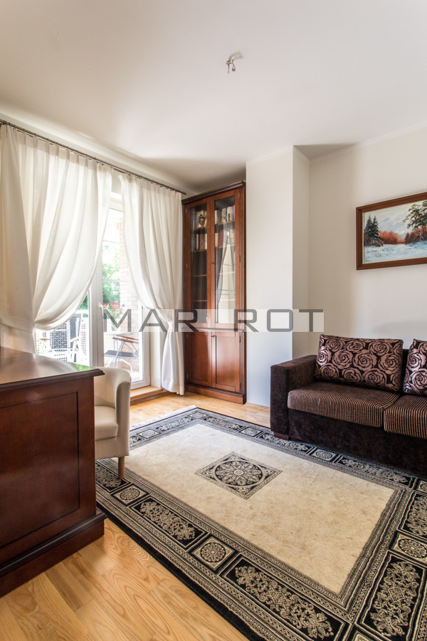Z gabinetu i sypialni wyjście na zadaszoną loggię z widokiem na ogród.