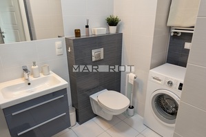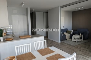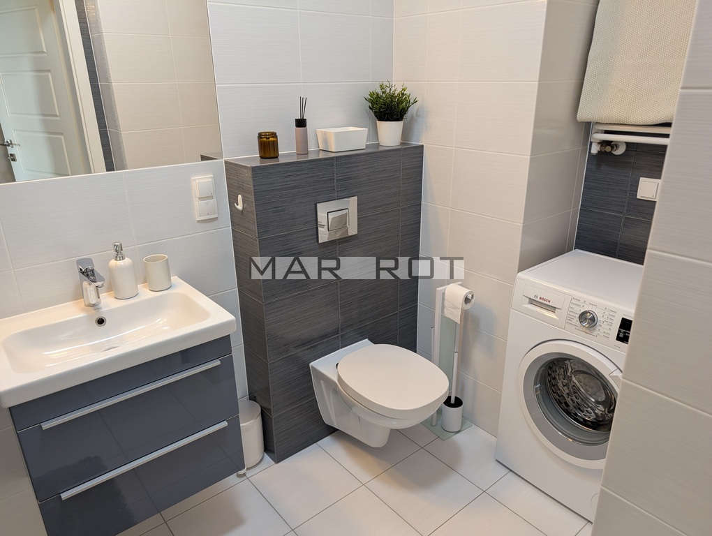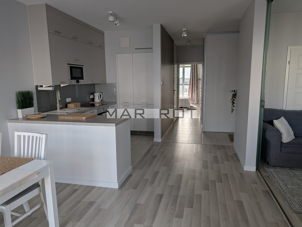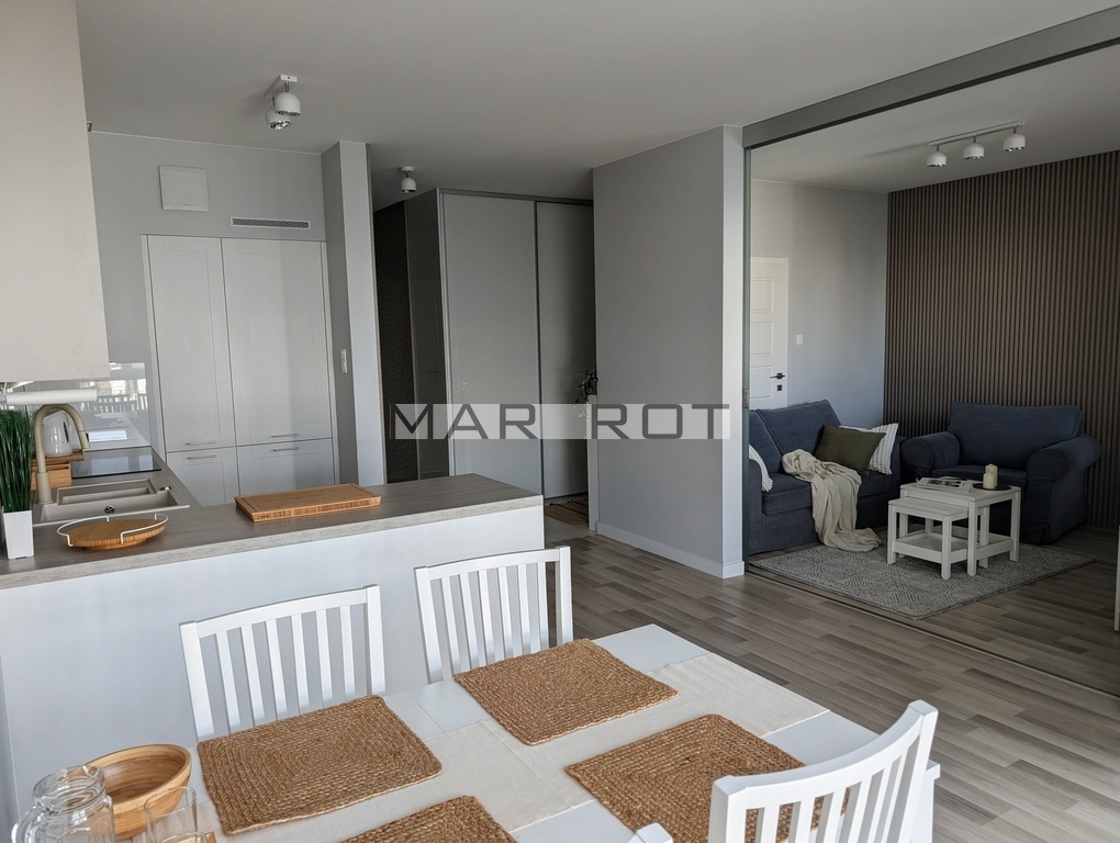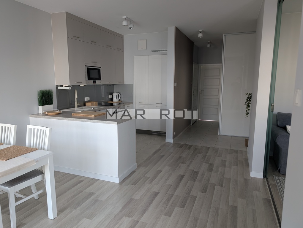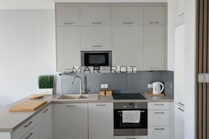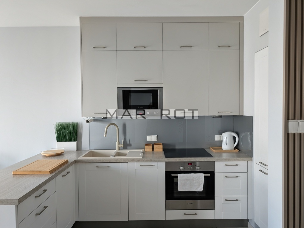 Mieszkanie jest w pełni umeblowane oraz wyposażone w sprzęty AGD i RTV pralka, zmywarka, czajnik, lodówka z zamrażarką, piekarnik, płyta indukcyjna, mikrofalówka, okap, telewizor.