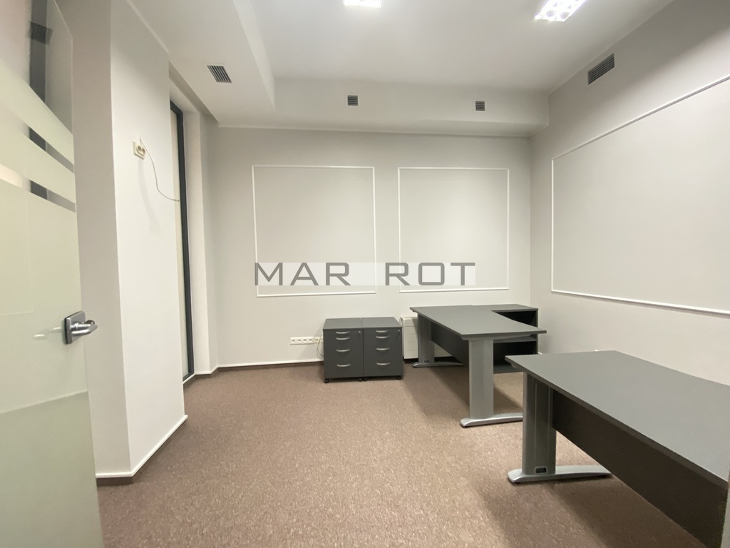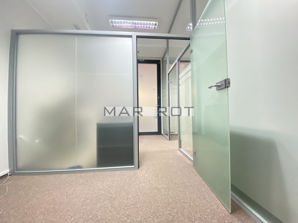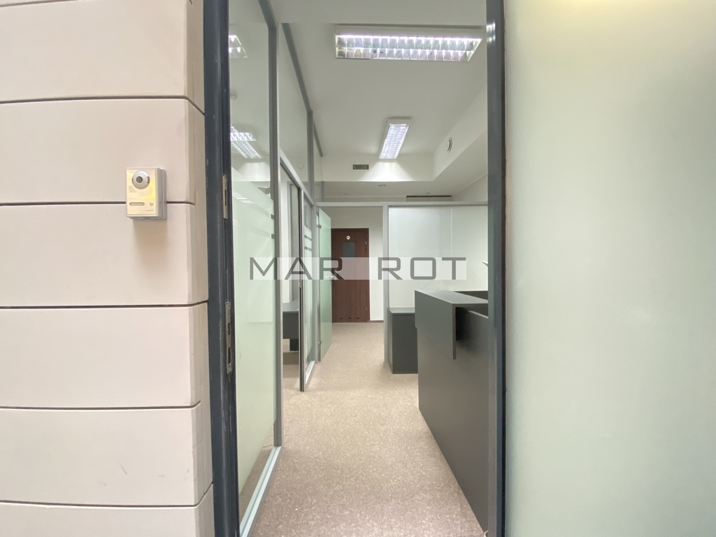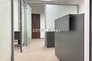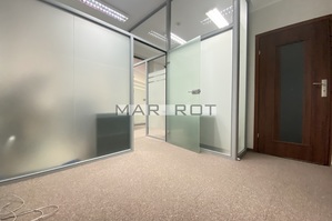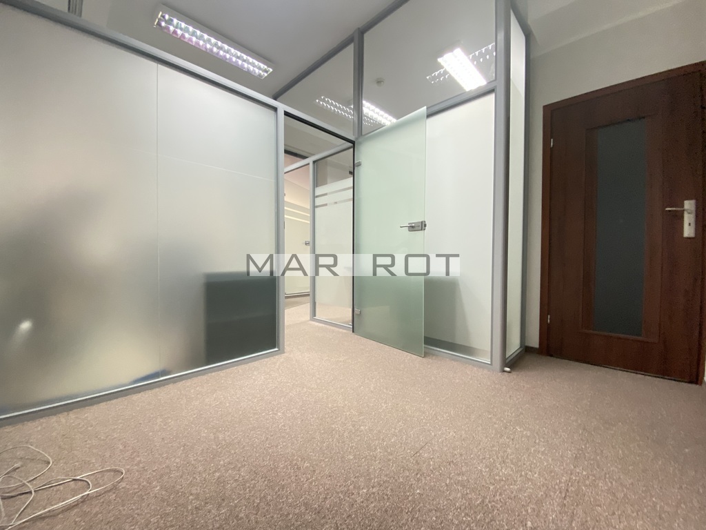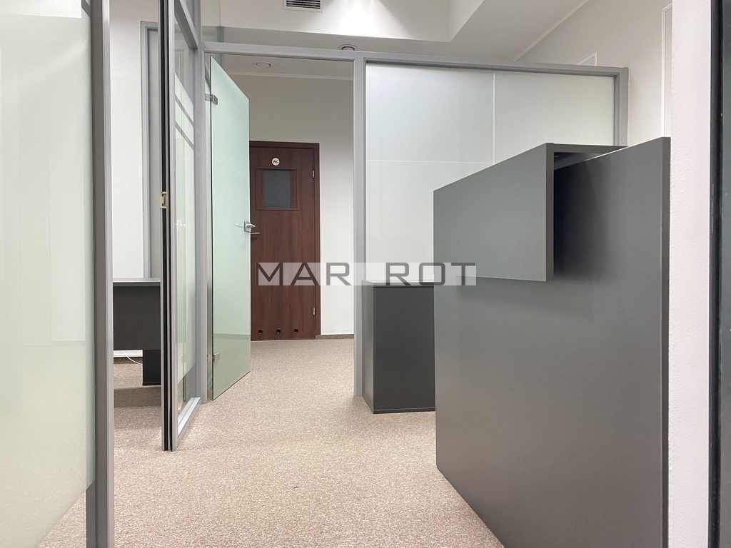 Lokal podzielony ściankami szklanymi na mniejsze pomieszczenia sala konferencyjna [15 mkw], gabinet z wbudowaną szafą pancerną w ścianie [8,6 mkw] i recepcja [7,5 mkw], WC i pomieszczenie socjalne, szafa na ubrania.