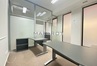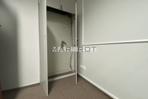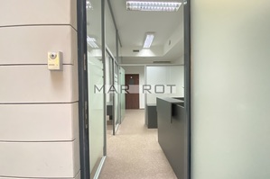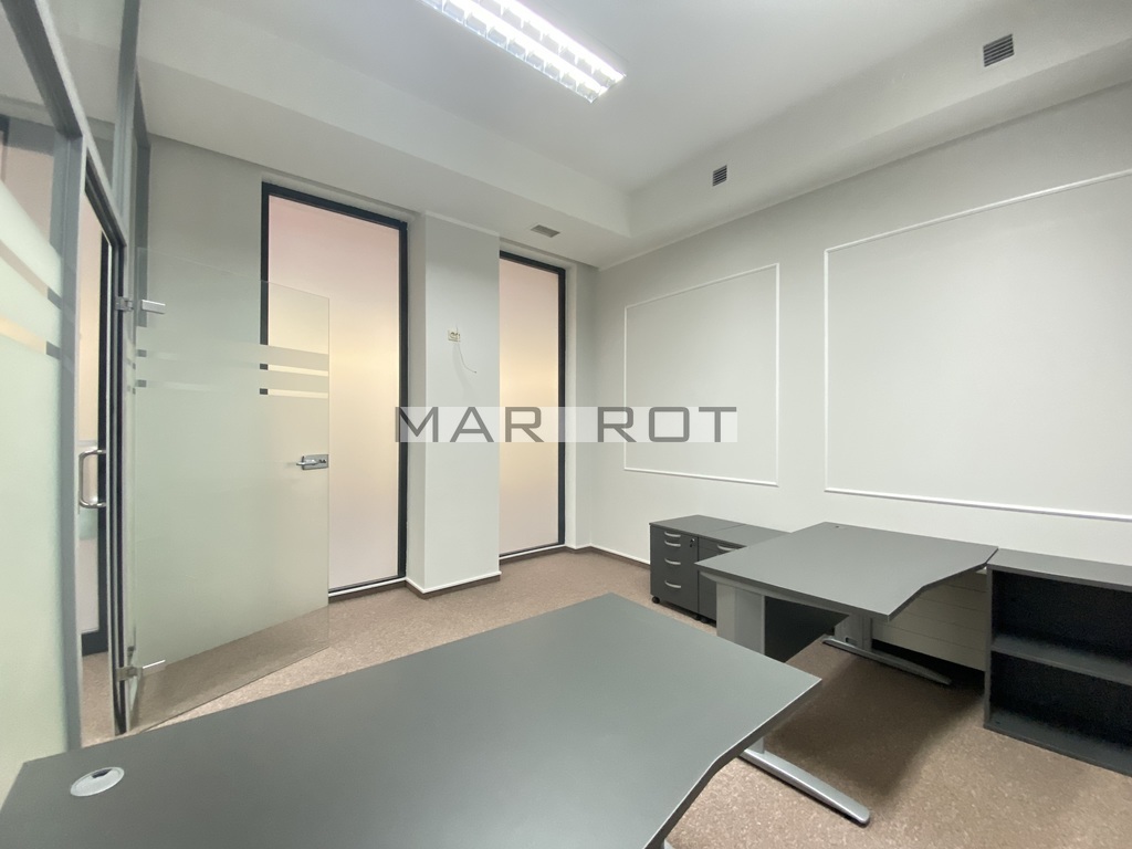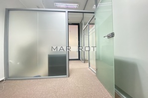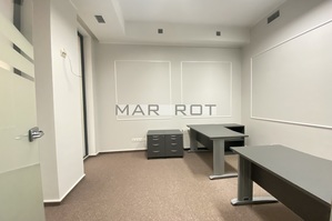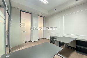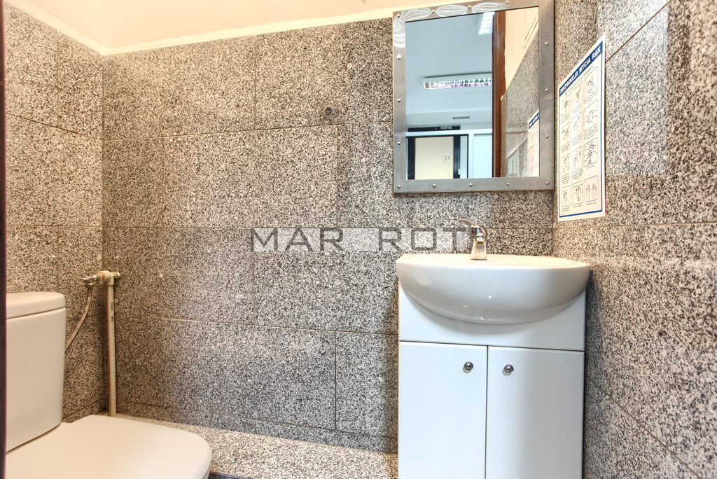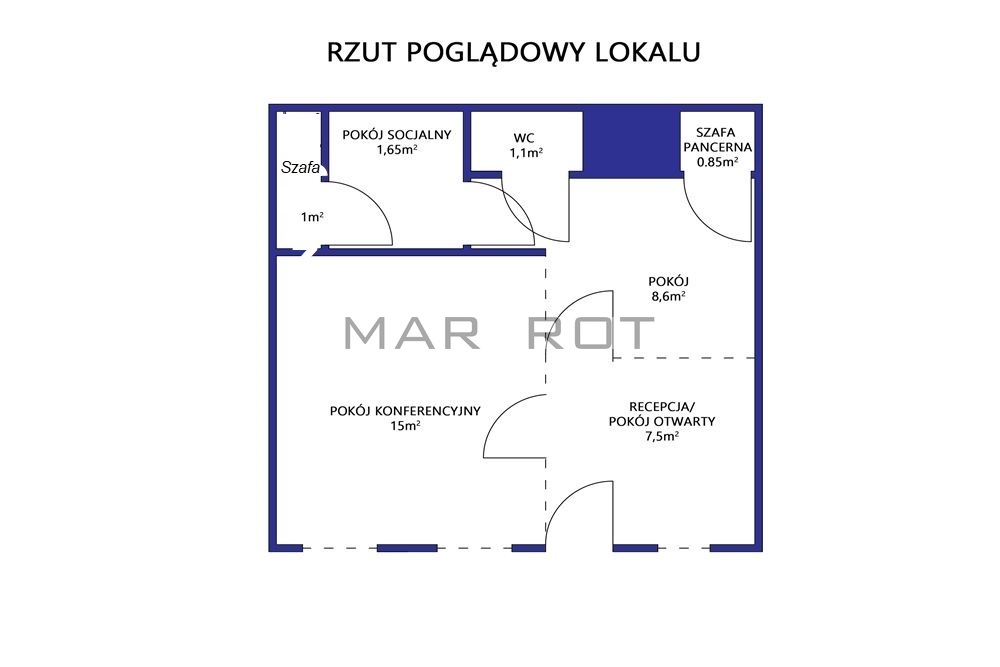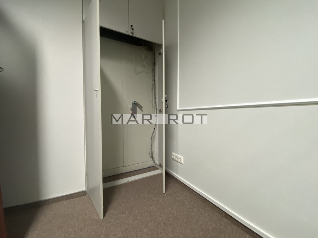 Lokal podzielony ściankami szklanymi na mniejsze pomieszczenia sala konferencyjna [15 mkw], gabinet z wbudowaną szafą pancerną w ścianie [8,6 mkw] i recepcja [7,5 mkw], WC i pomieszczenie socjalne, szafa na ubrania.