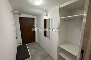 Komfortowy przedpokój z miejscem do siedzenia, wieszakiem i szafą na ubrania wierzchnie.