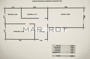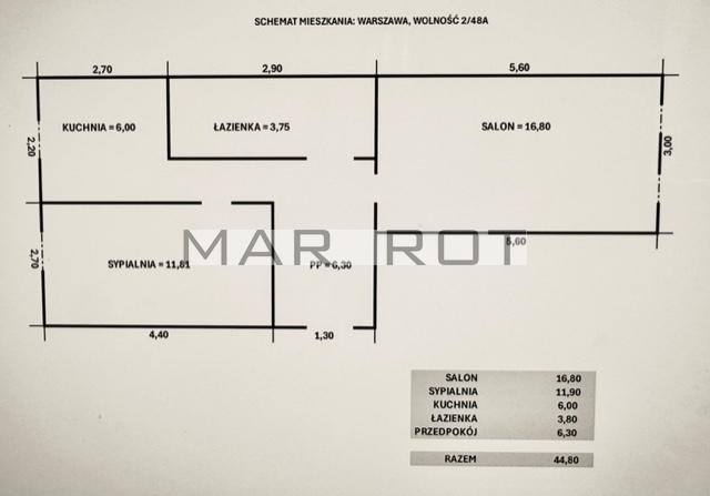 Obmiar powierzchni całego mieszkania przy podłodze to 44,80 mkw.