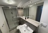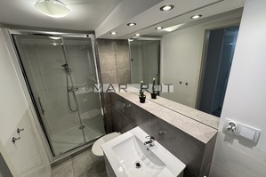 Łazienka z dużym prysznicem, dużym lustrem i wydajnym oświetleniem dodatkowo pralka.