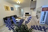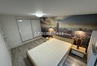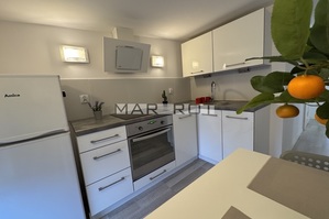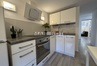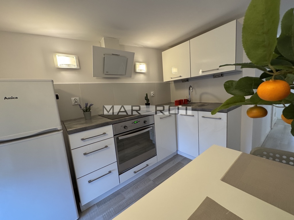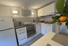Kuchnia wyposażona w płytę indukcyjną, lodówkę z zamrażarką i wszystko co potrzebne do przygotowywania posiłków dodatkowo stół i krzesła.