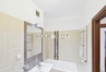 łazienka wyposażona w wannę, umywalkę, WC i pralkę