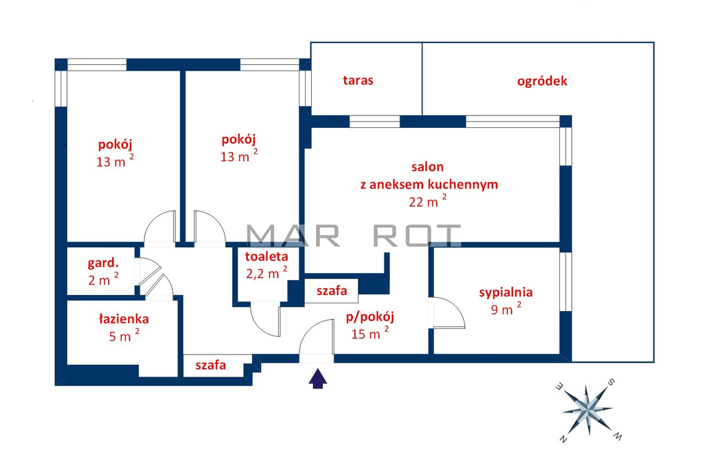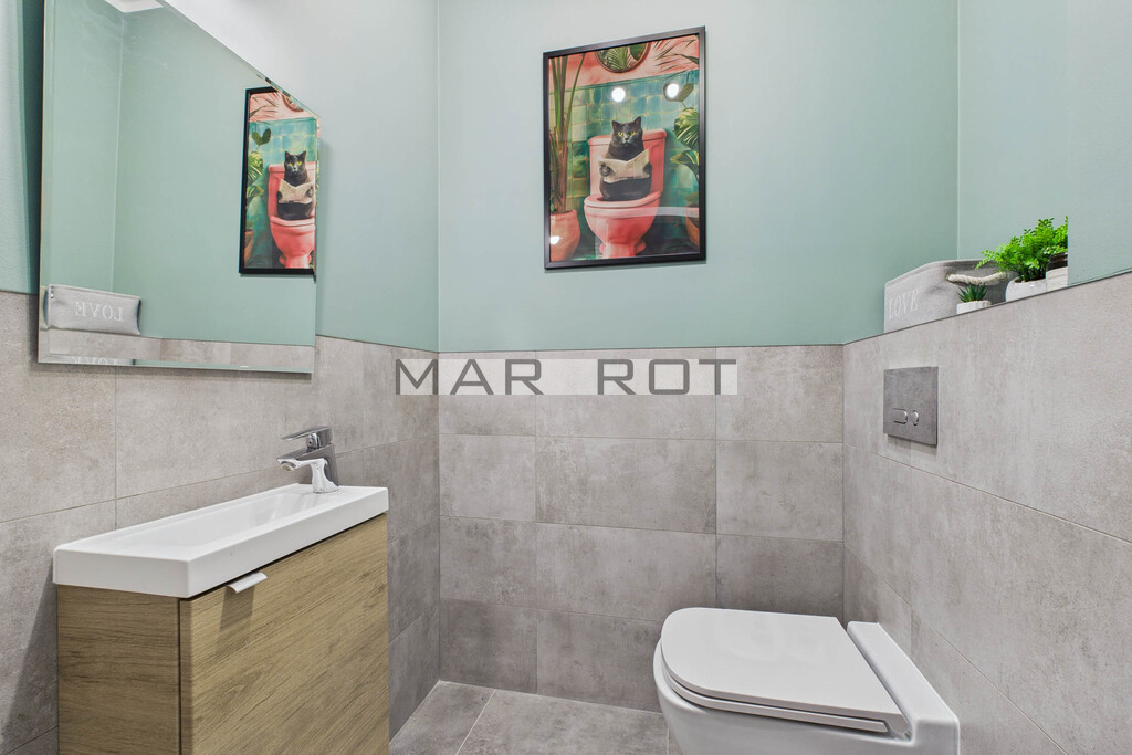 W skład lokalu wchodzi salon z dużym aneksem kuchennym, wyjściem na taras i do ogródka, 3 sypialnie, garderoba, p/pokój, łazienka z wanną i WC oraz oddzielne WC.