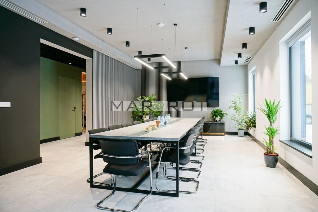 Obiekt z 2025r., nowocześnie i gustownie wykończony. Do dyspozycji najemcy WC, pokój socjalny z aneksem kuchennym i sala konferencyjna na parterze. Cały budynek jak i poszczególne pokoje są klimatyzowane. Posiadają również dostęp do Internetu.