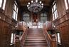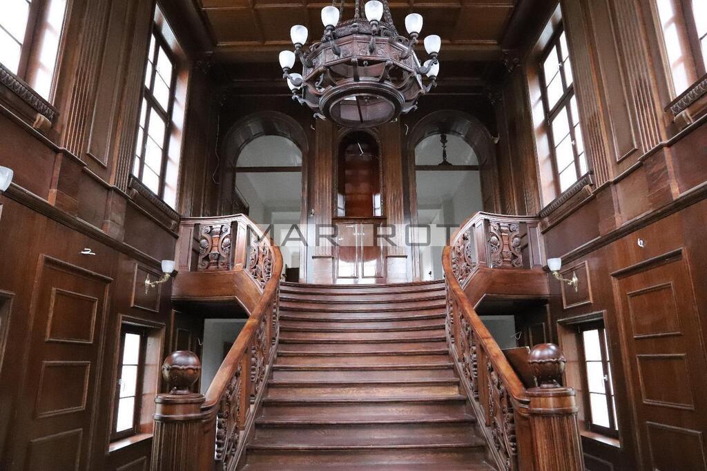 W sieni zachowały się paradne schody z bogato rzeźbioną drewnianą balustradą.