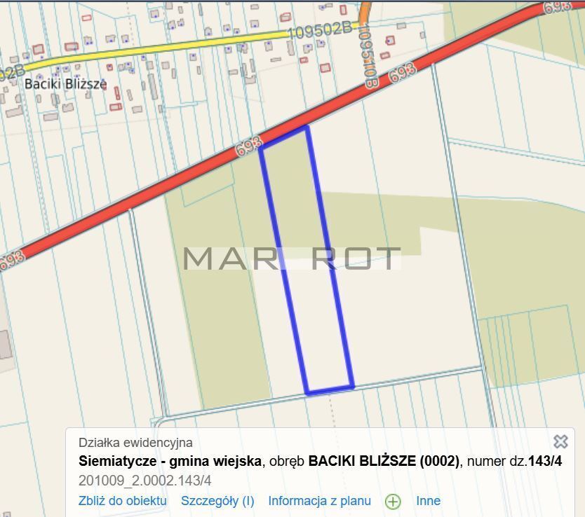 Przedmiotowa nieruchomość gruntowa stanowi działkę oznaczoną w ewidencji nr 143/4 o powierzchni 2,78 ha obręb 0002 Baciki Bliższe, gm. Siemiatycze.