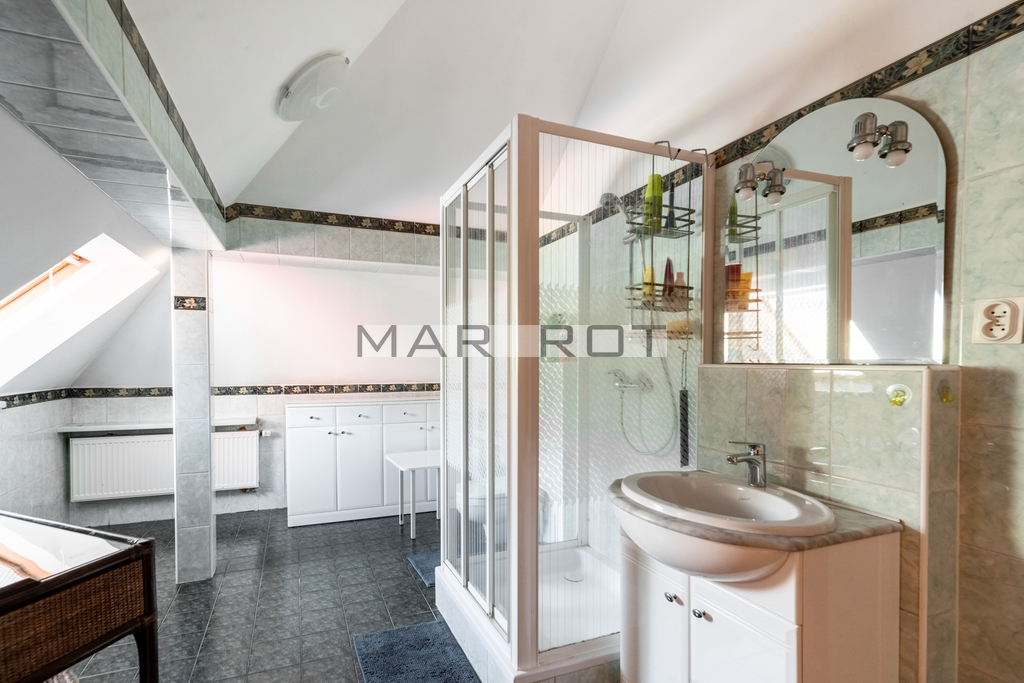 Na piętrze 2 sypialnie (21 i 19m2) z własnymi garderobami i łazienkami, oraz dodatkowa sypialnia/gabinet (11m2) oraz wyjście na strych.