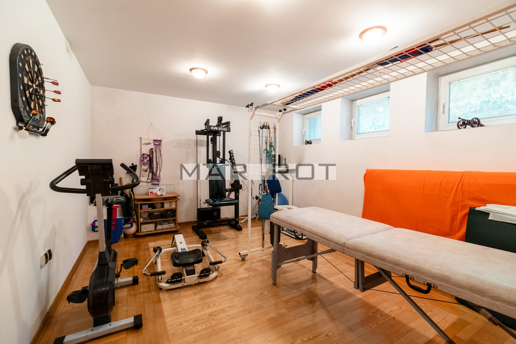 Dom jest częściowo podpiwniczony. W ładnie zagospodarowanym przyziemiu znajduje się salka do ćwiczeń (cały znajdujący się tam sprzęt zostaje w nieruchomości dla nowych właścicieli), pokój kominkowy (27m2), sauna, łazienka, pralnia, 2 spiżarnie oraz kotłownia.