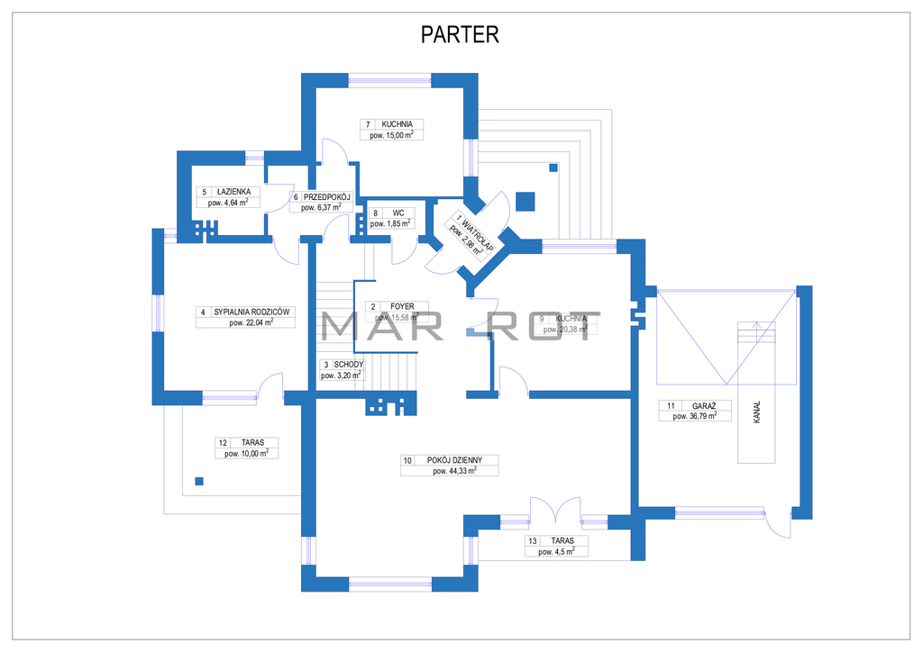 Na parterze część główna składająca się kuchni (20m2), dużego foyer (16m2), salonu z jadalnią (44m2) i wyjściem na taras prowadzącym do ogrodu oraz WC.