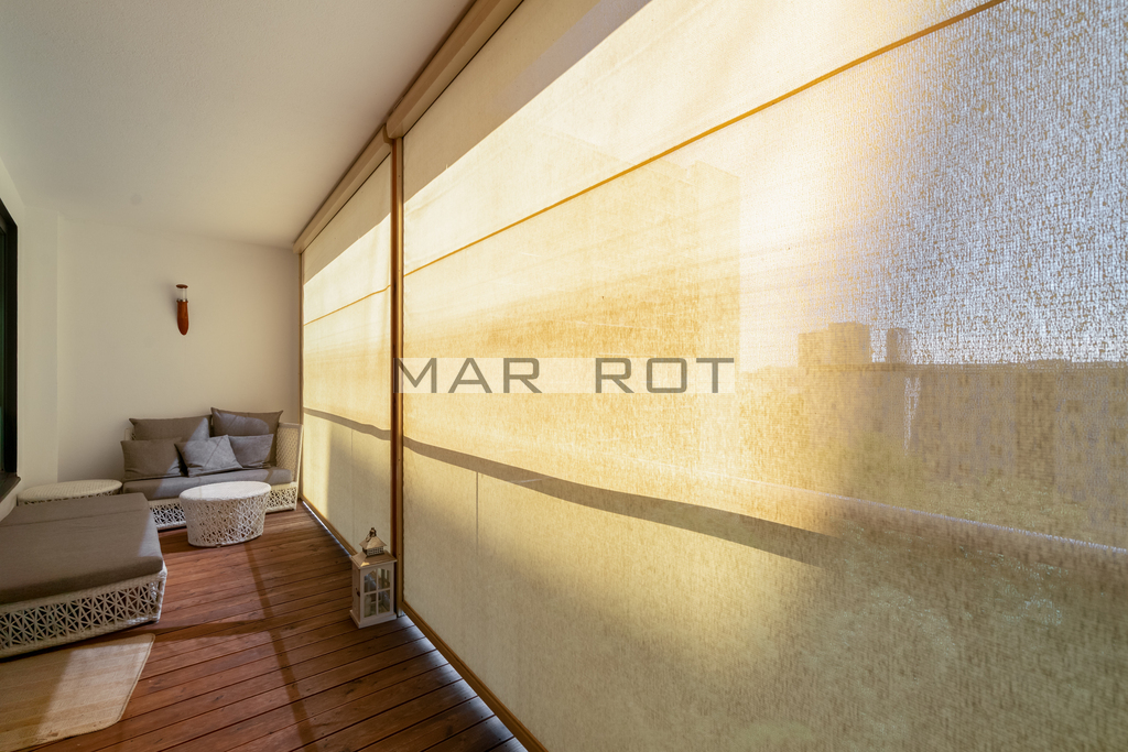 Dwie jasne rolety zewnętrzne typu screen, stanowiące doskonałą ochronę przed zbyt dużym nasłonecznieniem lub wiatrem.