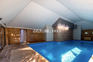 This impressive building houses 10 rooms and 6 bathrooms, a TV room, a sunroom, a utility room, and an outdoor, indoor swimming pool.