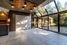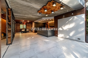 It impresses with its approximately 6-meter-high living room with panoramic windows offering views of the beautiful greenery of the garden.