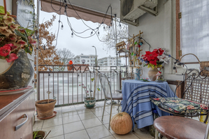 -duży balkon i zieleń wokół budynku.