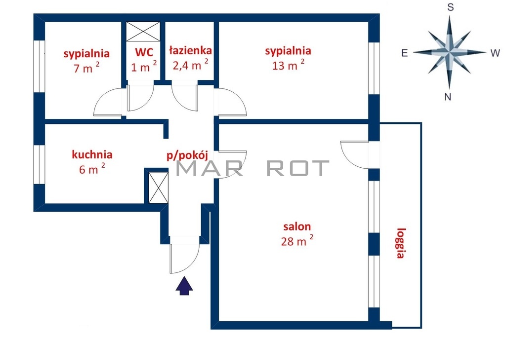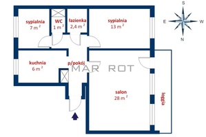 Lokal doskonale usytuowany w stosunku do stron świata pokój z balkonem oraz sypialnia od południowego zachodu, kuchnia i druga sypialnia od wschodu.