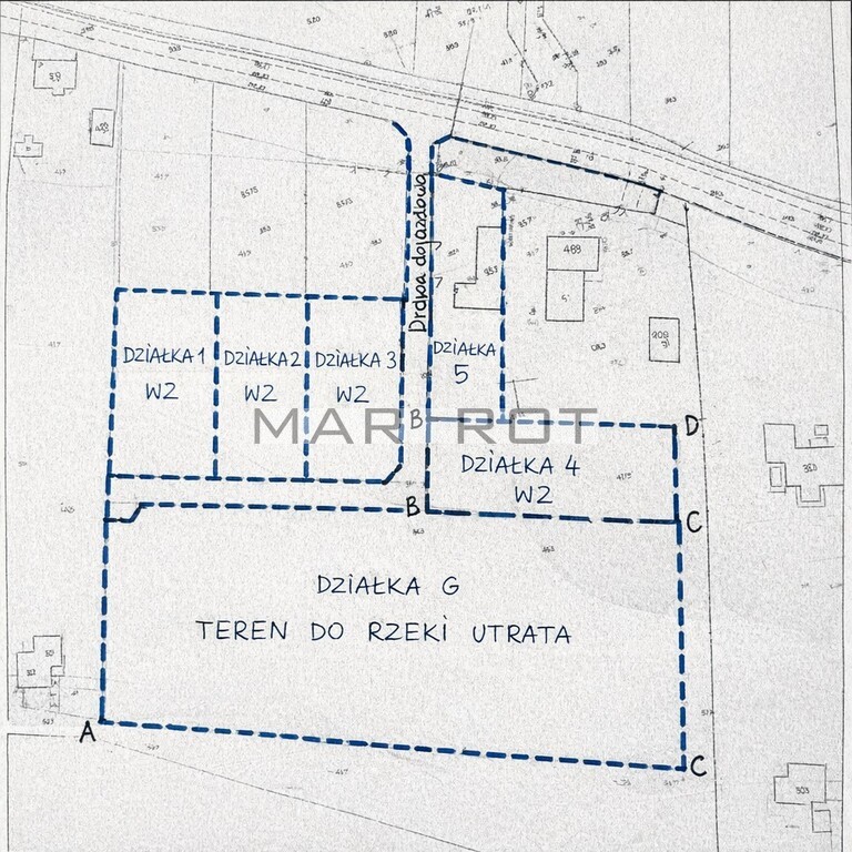 W wyniki podziału powstaje 6 działek 4 działki z WZ o pow. ok. 1200m, 1 działka zab. bud. gospodarczym ok. 1000 oraz pozostałość wynikająca z podziału całości ok. 3ha.