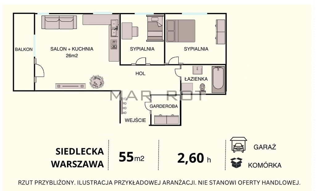 To 3pokojowe mieszkanie przy ul. Siedleckiej to idealna propozycja dla osób, które chcą mieszkać komfortowo, funkcjonalnie i blisko wszystkiego, co ważne na co dzień. Gotowe do wprowadzenia, z dużym balkonem, garderobą, miejscem w garażu i komórką lokatorską świetne zarówno dla rodziny, jak i jako pewna inwestycja pod wynajem.