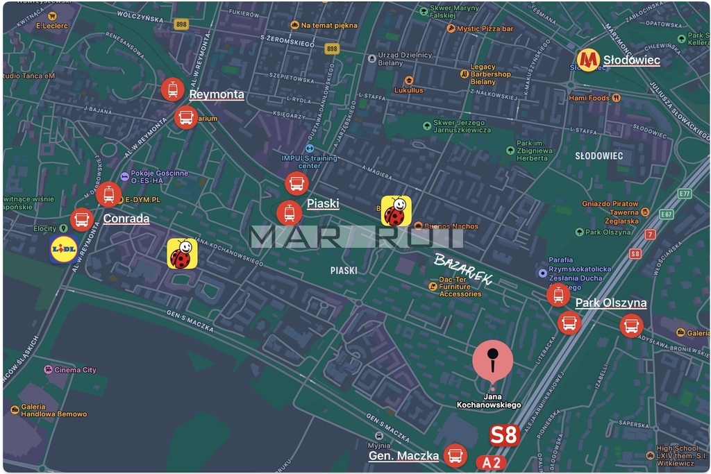 Budynek mieści się na spokojnym, zielonym osiedlu w pobliżu parku (Park Olszyna), a jednocześnie w miejscu doskonale skomunikowanym. W bliskim sąsiedztwie znajdują się liczne przystanki autobusowe i tramwajowe, a najbliższa stacja metra (M1 Słodowiec), oddalona jest od mieszkania o niecałe 1,5 km. Nieopodal wjazd na Aleję Prymasa Tysiąclecia oraz trasę S8, co znacznie usprawnia poruszanie się autem po mieście i jego okolicach.