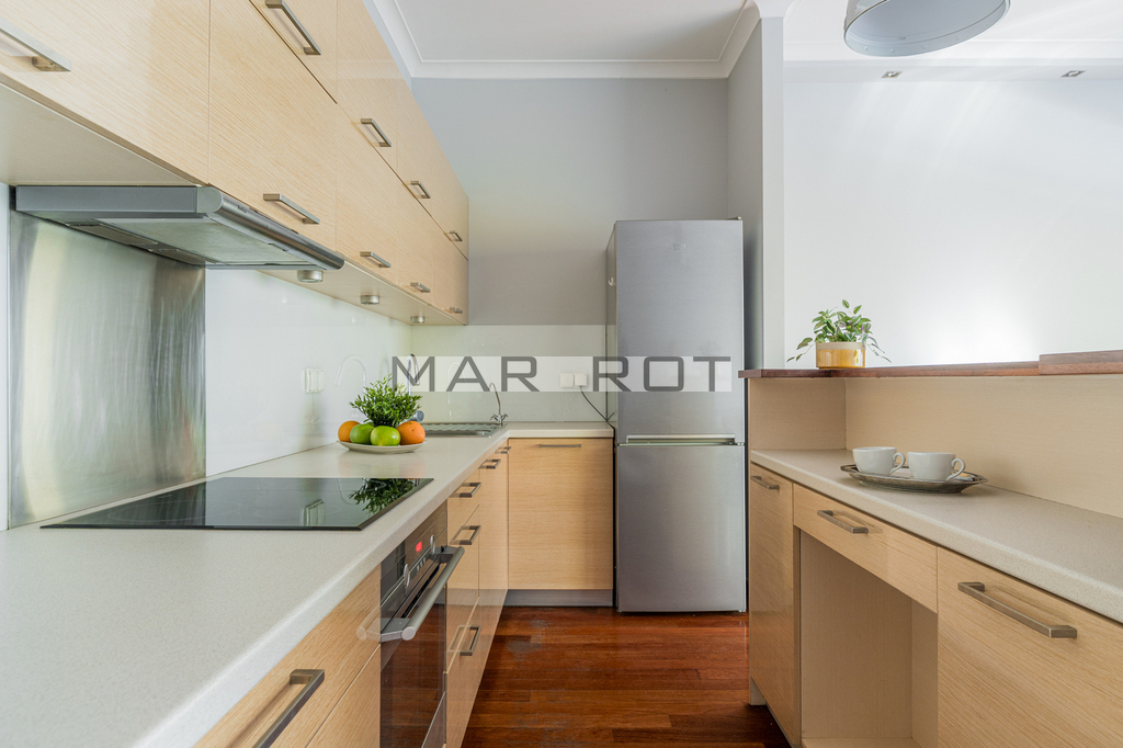 - kuchnia wyposażona w sprzęty AGD, lodówkę z zamrażarką, piekarnik, płytę indukcyjną, zmywarkę, okap