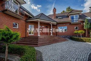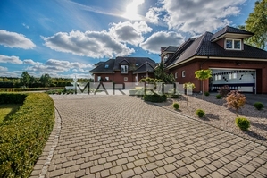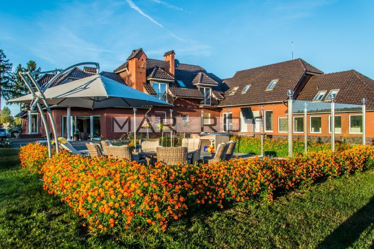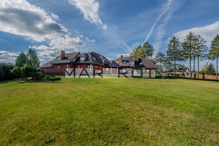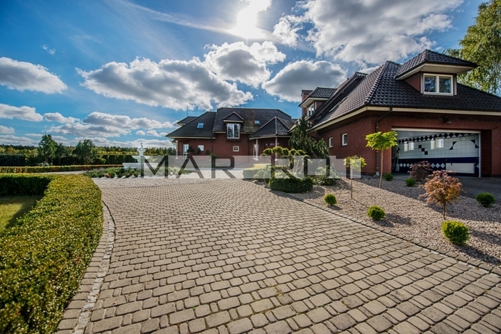 Budynek znajduje się na prostokątnej działce i prowadzi do niego elegancki podjazd. Do budynku przynależą dwa duże miejsca garażowe z elektrycznymi drzwiami, oprócz tego wiele miejsc parkingowych przy domu. Prezentowana nieruchomość składa się z 2 pięter naziemnych i jednego podziemnego. Zamknięta, bezpieczna, ogrodzona, oświetlona brama wejściowa na pilot. Za domem znajduje się duży ogród ze stawem i drugie wejście prowadzące do pomieszczeń na parterze. Dom został urządzony przy użyciu najwyższej jakości materiałów i starannie wykończony. Drzwi wewnętrzne są drewniane, tak jak i schody w całym domu.