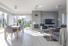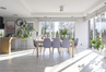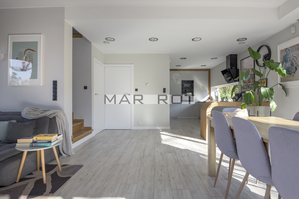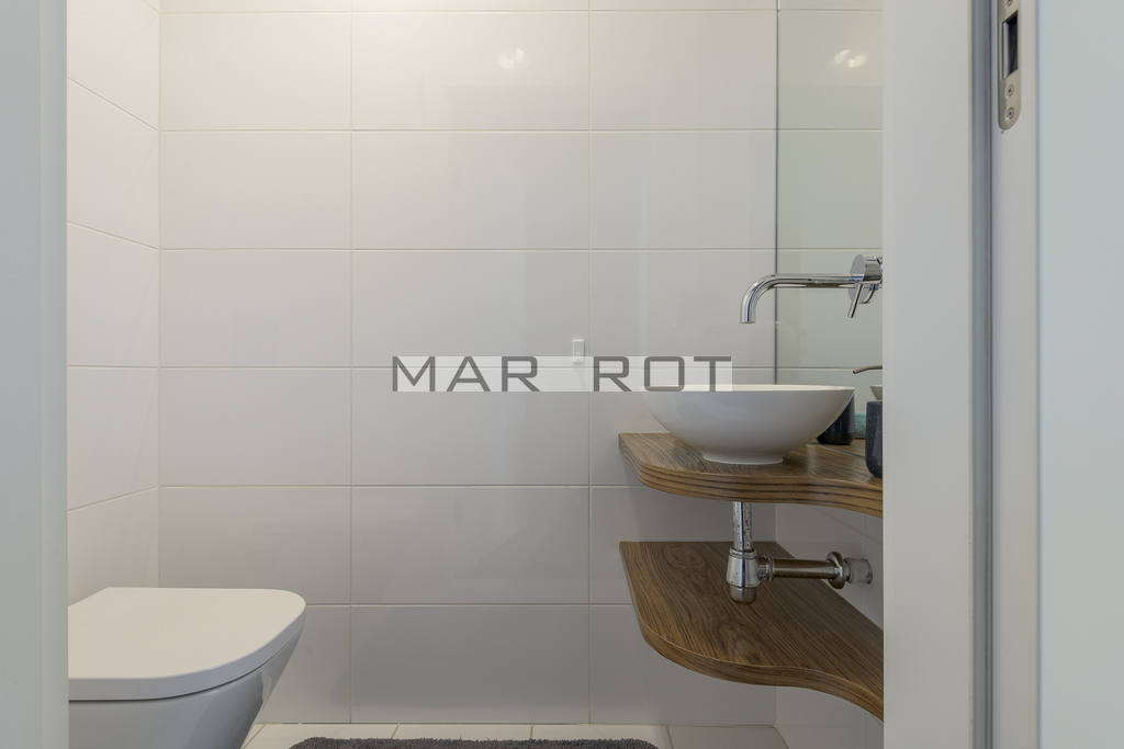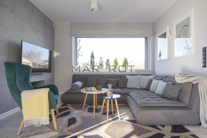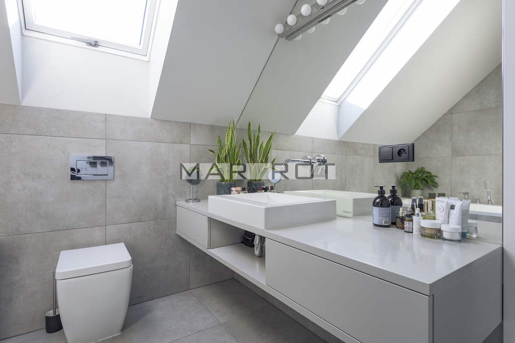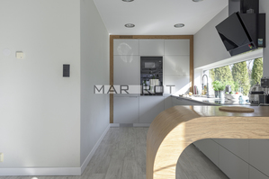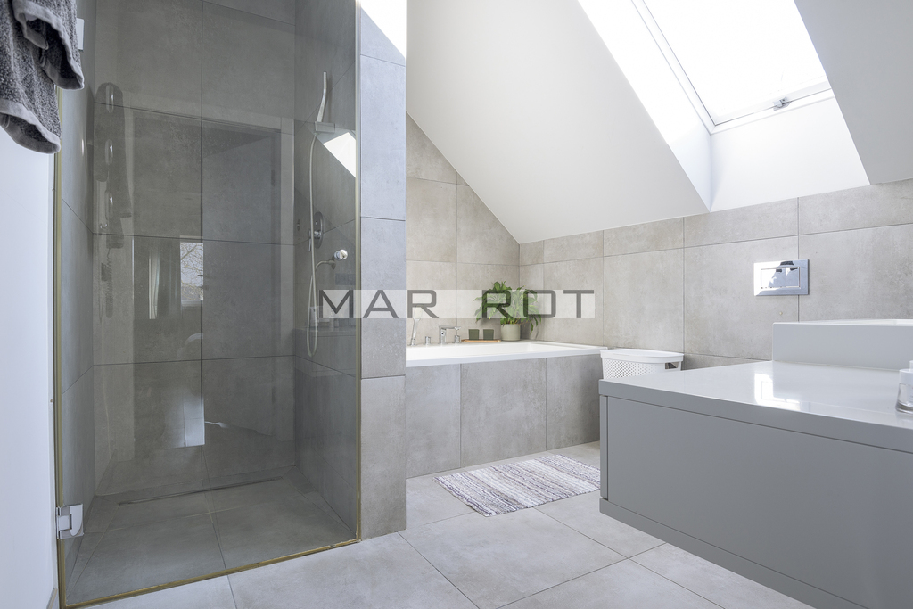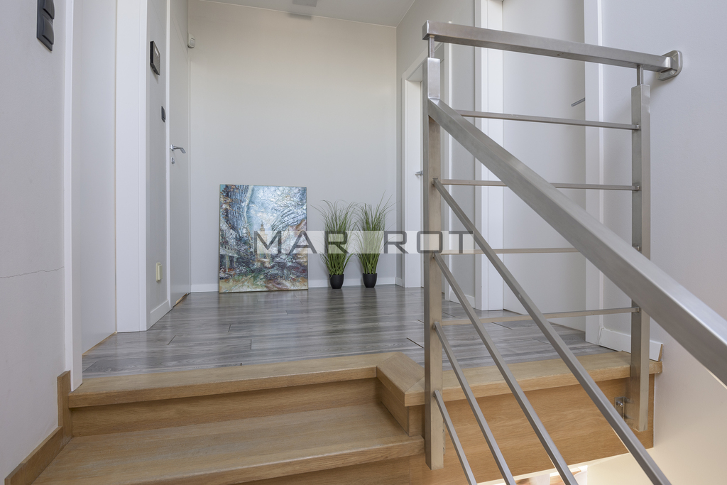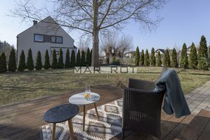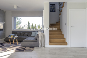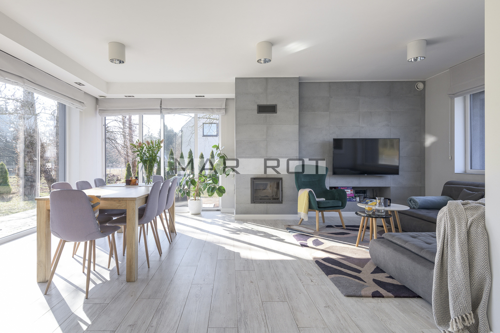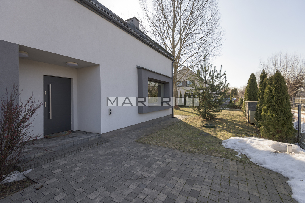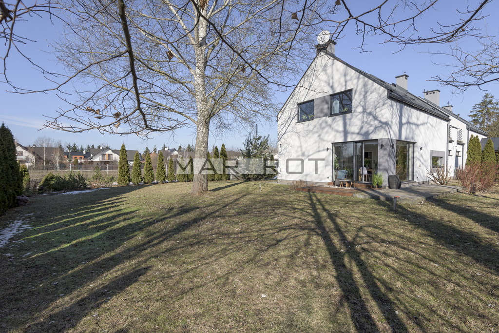 Bliźniak połączony wyłącznie garażem i tarasem - co zapewnia prywatność porównywalną z domem wolnostojącym. Położony na dużej działce o powierzchni 610 m2 ze starodrzewiem i automatycznym systemem nawadniania. Część ogrodowo-tarasowa od strony południowej. Charakterystycznym elementem tego domu są nie standardowe duże przeszklenia.