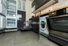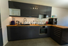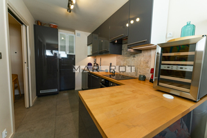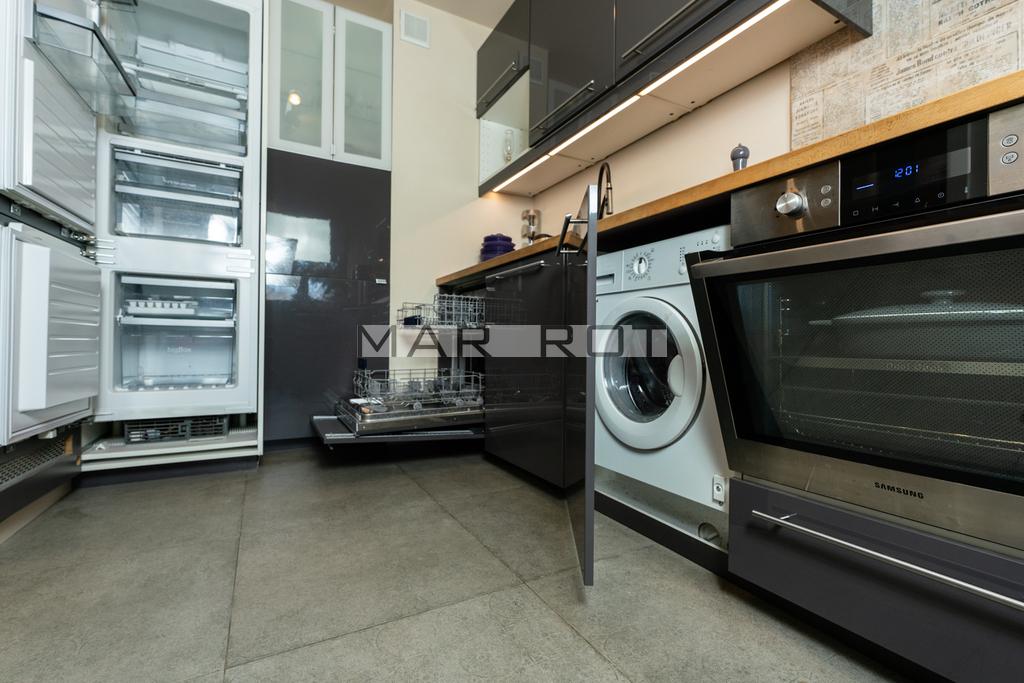 Kuchnia wykonana na wymiar i w pełni wyposażona (zmywarka, lodówka, piekarnik, płyta, okap, pralka, chłodziarka do wina). Całość utrzymana w nowoczesnym, spójnym stylu.