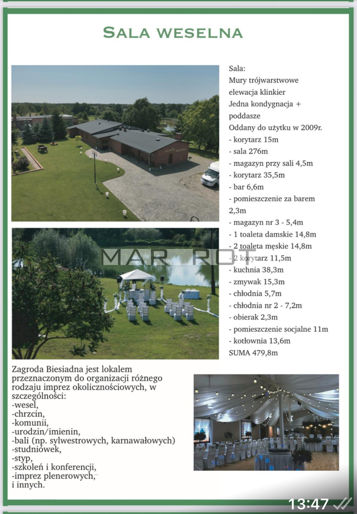 Centrum Wydarzeń Profesjonalna sala eventowa, która jest sercem przychodów kompleksu. Baza Noclegowa Komfortowy budynek hotelowy (18-24 miejsca) oraz wielokondygnacyjny budynek mieszkalny. Rekreacja i Klimat Stylowa stajnia oraz dodatkowe budynki gospodarcze, tworzące unikalny klimat nowoczesnej agroturystyki. Skala Łącznie blisko 1400 m2 powierzchni użytkowej pod dachem. Liczby, które mówią same za siebie Wartość Inwestycyjna 18 000 000 - 22 000 000 PLN - WYCENA WG. OPERATU Potencjał Rynku Nieruchomość idealnie wpisuje się w rosnące trendy rynku weselnego i agroturystyki premium. Zdywersyfikowane źródła dochodu Wesela, eventy firmowe, noclegi i potencjał deweloperski gruntów.Inwestuj w aktywa, które widać, czuć i które zarabiają.