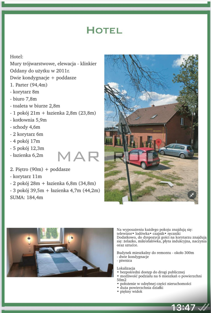 - Sala Eventowa Serce obiektu, generujące stabilne dochody z wesel i wydarzeń.- Budynek Hotelowy Oferujący 18-24 miejsca noclegowe.- Budynek Mieszkalny Wielokondygnacyjny, idealny dla właściciela lub pod wynajem.- Stajnia oraz Pozostałe Budynki Doskonałe zaplecze pod agroturystykę i rekreację.